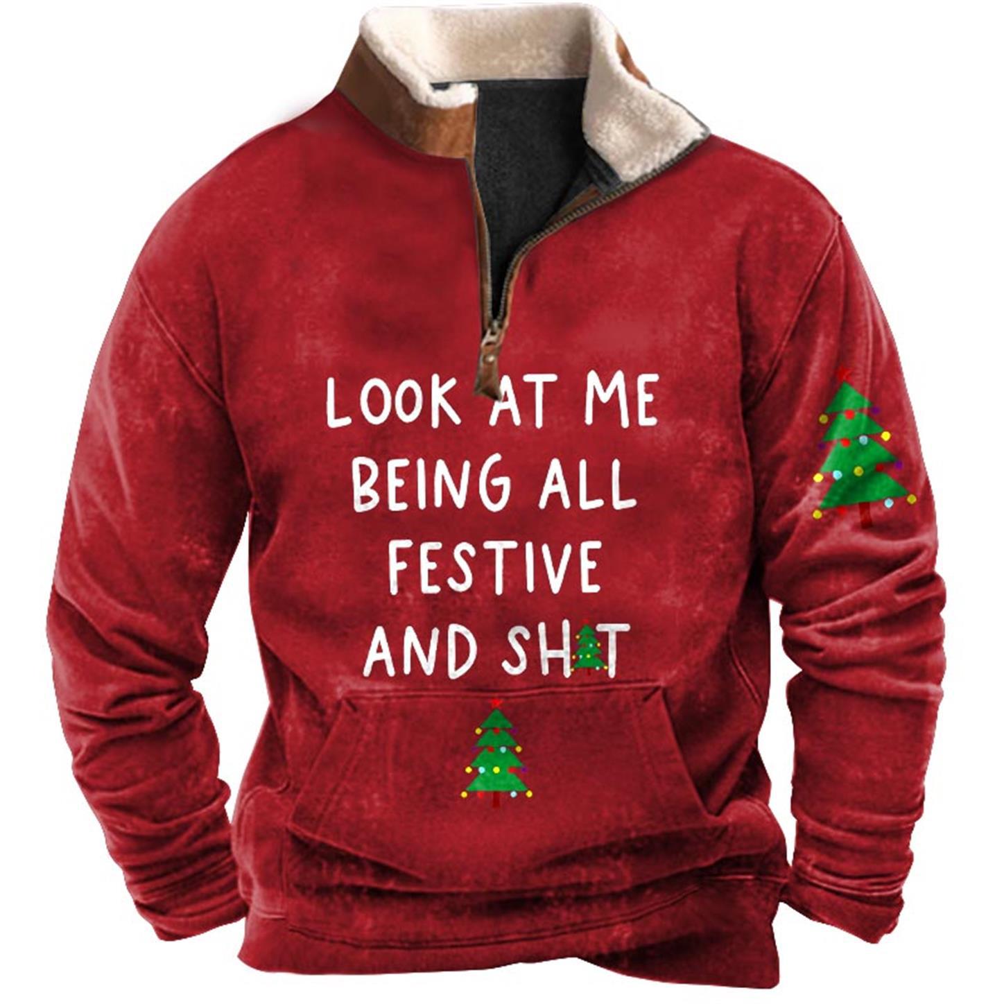 Men's Sweatshirt Quarter Zip Look At Me Being All Festive Funny Christmas Plush Collar Vintage Daily Tops