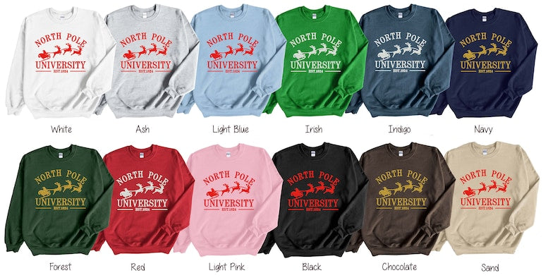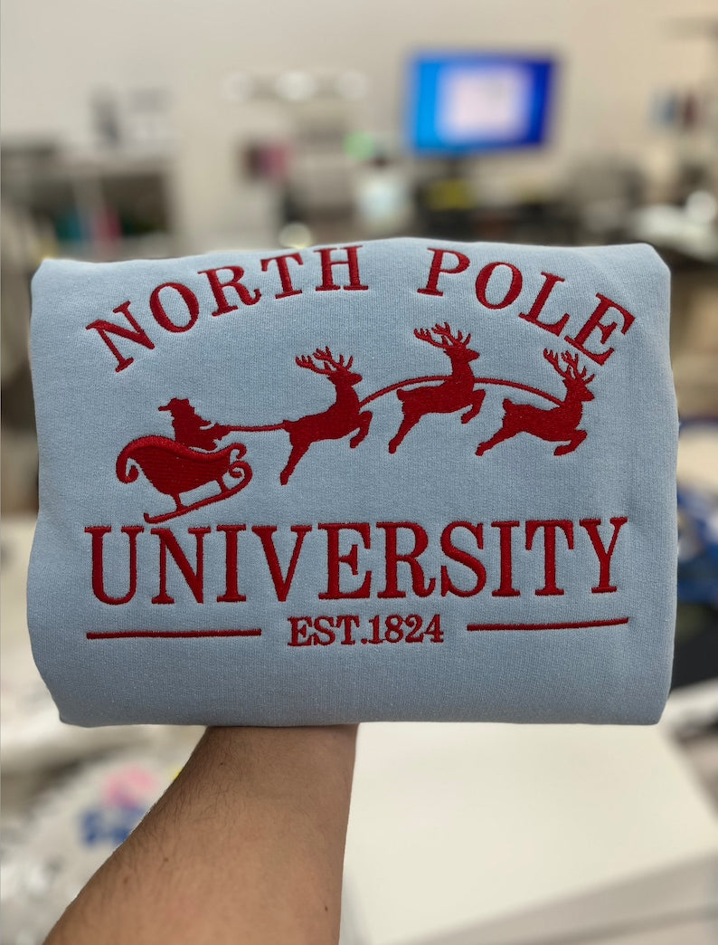 North Pole University Christmas Embroidered Sweatshirt, Holiday Apparel, Holiday Sweatshirt, Cozy Christmas Embroidery, Christmas Gifts
